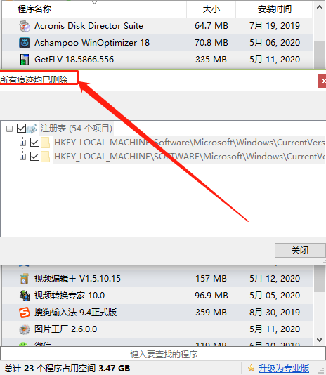 6.最后残留数据也清理完成,我们就可以看到界面左上角有所有痕迹均已删除这个提示了,这样强制卸载程序的操作就完成了。