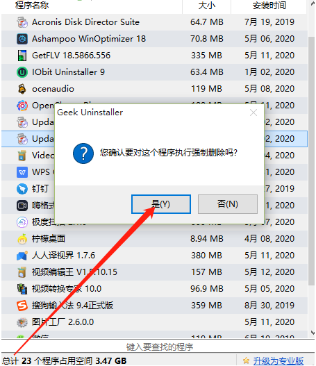 4.点击强制删除之后会出现下图所示的一个问题窗口,询问我们是否确定删除该程序,点击是按钮即可进行删除操作。