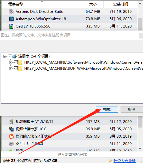 5.点击删除程序之后会自动扫描残留的文件数据,注册表数据等,扫描出来之后我们点击完成按钮即可清理这些残留数据。