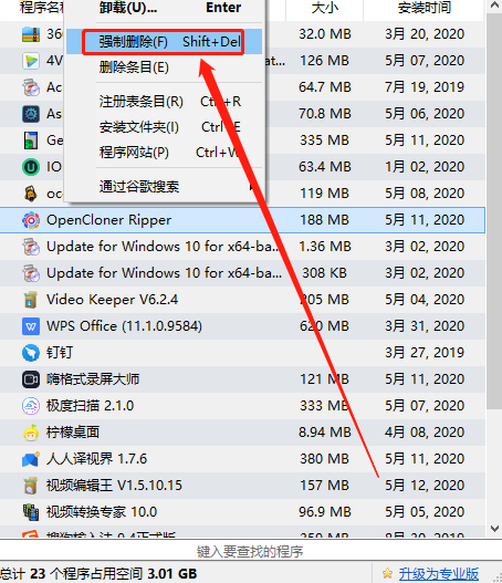 3.搜索完成选中想要强制删除的程序之后,点击上方的操作选项,在出现的选项中点击强制删除这个功能。