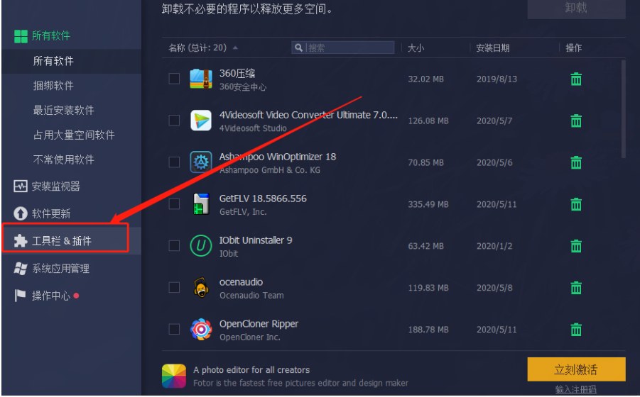 1.首先第一步我们打开软件之后需要点击界面左边功能选项中的“工具栏&插件”这个选项,如下图中所示。