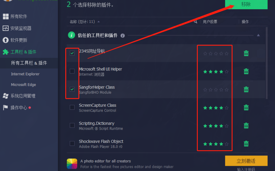 3.点击之后我们在右边界面中就可以看到电脑中所有的插件了,可以看到每一个插件用户的投票数量,然后勾选自己想要删除的插件,点击上方移除按钮。