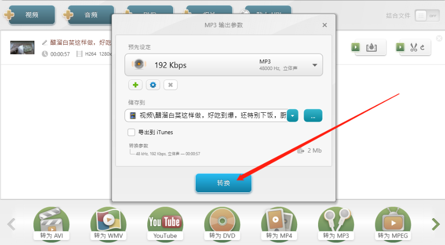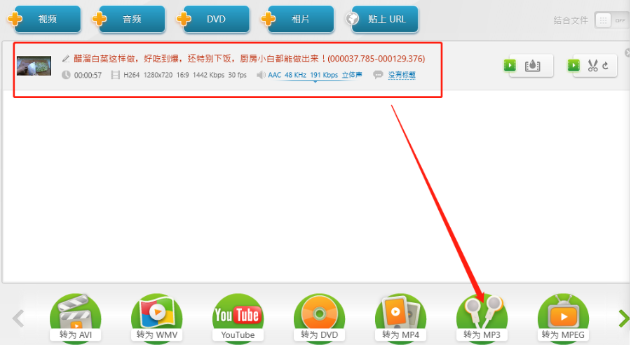3.点击打开按钮之后视频文件就成功添加到软件界面中了,然后我们点击下方的转为MP3这个功能图标。