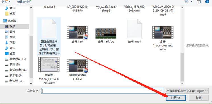2.点击添加视频的按钮之后,下一步就是在出现的选择文件界面中选择想要进行转换的视频文件,选中之后点击右下角的打开。