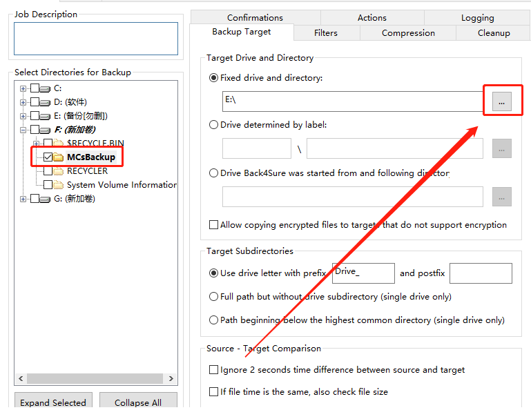 2.点击选择好需要备份的文件夹之后,下一步就是在界面右边选择备份文件的目的地址,点击三点按钮之后即可打开选择文件的界面。