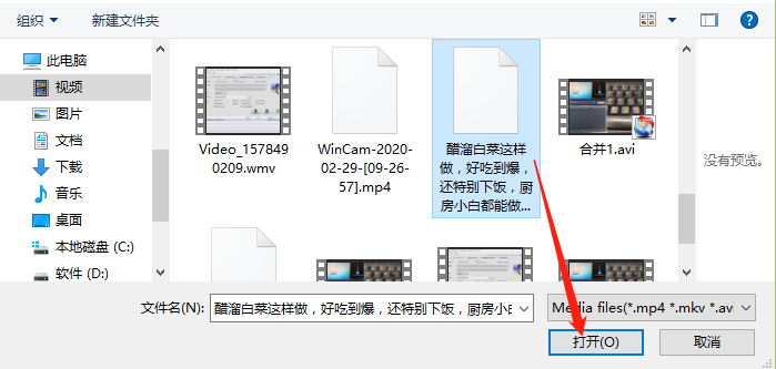 2.点击添加选项之后,下一步会打开一个选择文件的页面,我们在其中选择想要剪切的视频文件,选中之后点击打开按钮。