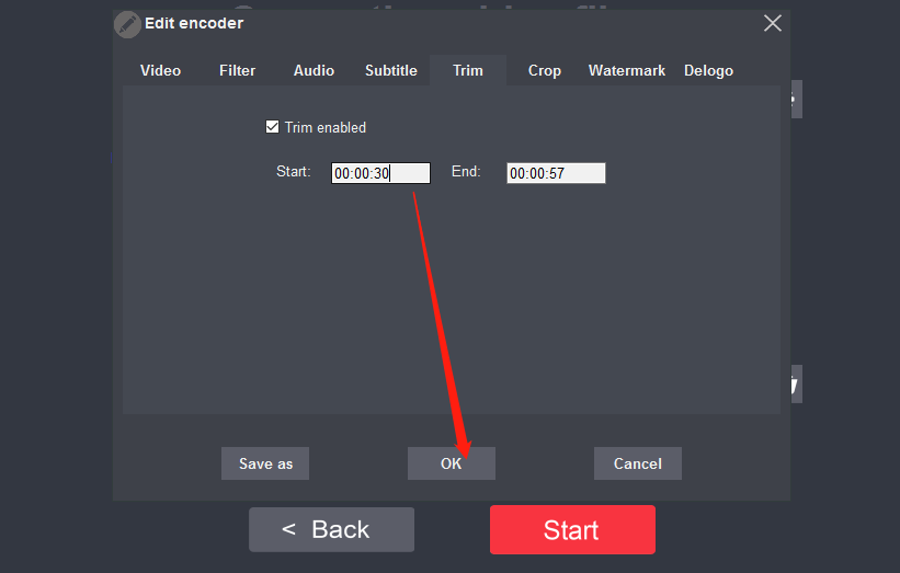6.勾选这个选项之后下一步我们就可以设置自己想要剪切的时间段了,事先需要打开视频查看,然后记住想要剪切的开始时间和结束时间,在这输入之后点击OK按钮即可。