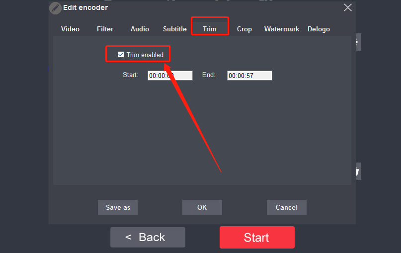 5.点击打开这个设置图标之后,在出现的设置界面切换到Trim剪切界面中,然后勾选Trim enabled这个选项。