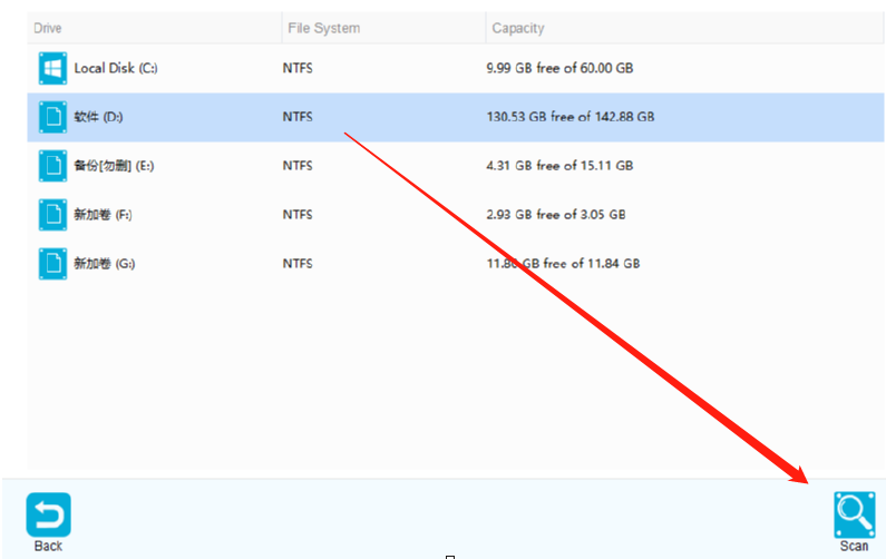 2.进入到删除文件恢复功能之后下一步是需要选择一个扫描恢复删除文件的磁盘,选择之后点击右下角的Scan按钮。