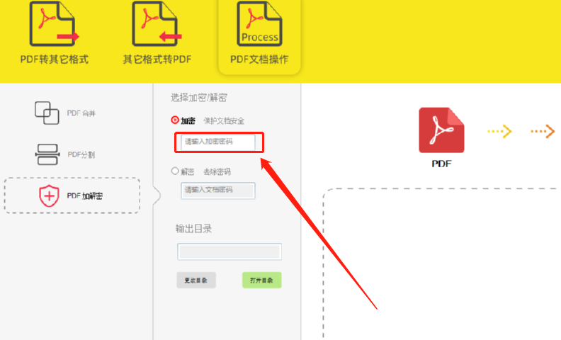 2.点击进入到PDF加解密功能之后,我们就可以现在加密这个模块中输入自己想要加密PDF文件的密码。