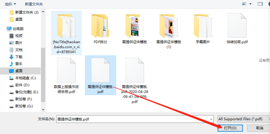 2.点击选择文件按钮之后界面中会出现一个选择文件的界面,在这个界面中我们选中想要提取图片的PDF文件,选中之后点击右下角的打开。