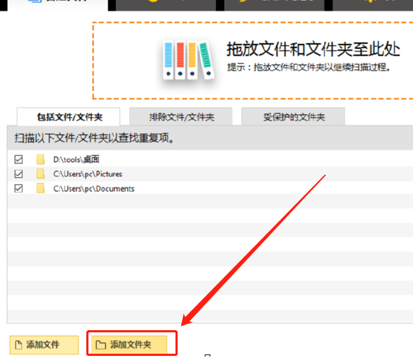 1.首先第一步我们打开软件之后在软件的界面中就可以看到扫描文件查找重复文件的一些选项了,如果用户需要单独添加文件夹进行扫描的话可以点击下方的添加文件夹按钮。