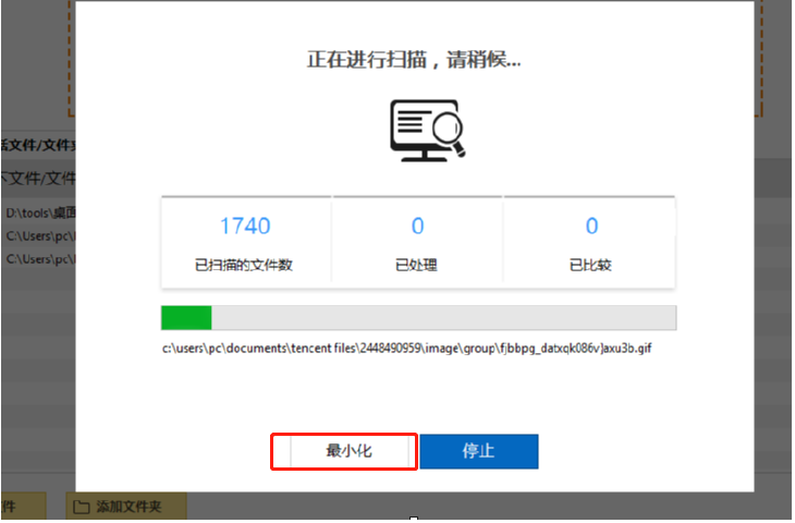 4.点击扫描重复文件这个按钮之后软件就会自动开始扫描操作了,在界面中会显示扫描进度,点击最小化按钮可以将界面最小化。