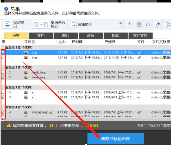 5.等到扫描完成之后在界面中就可以看到扫描出来的一些分好组的重复文件了,然后我们就可以点击选择其中想要删除的重复文件点击下方的删除已标记内容按钮来删除了。
