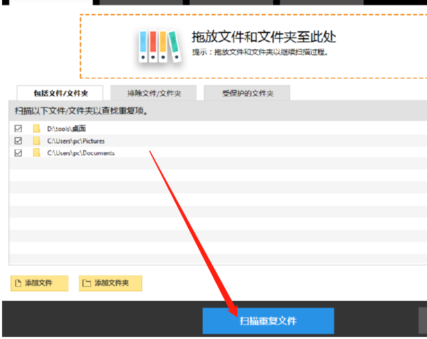 3.下一步我们将需要扫描的文件夹添加完成之后就可以点击界面下方的扫描重复文件这个功能按钮来开始扫描操作了。