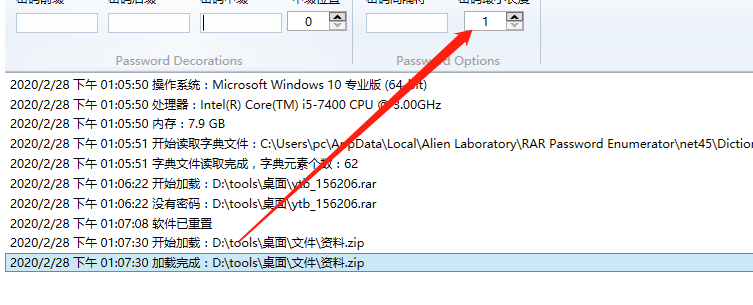3.点击将压缩文件成功加载到软件界面之后,我们在上方点击切换到密码选项这个设置界面,然后设置一下密码的一些参数,如果完全不知道密码的用户就可以忽略这个步骤。