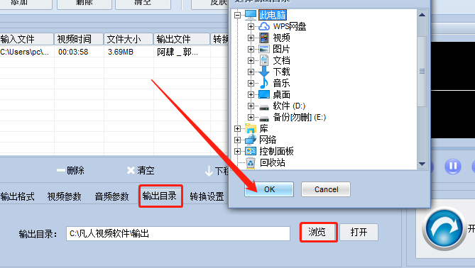 4.需要转换的格式选择完成之后,下一步就是切换到输出目录界面中,然后点击浏览按钮来自定义选择文件的输出目录。