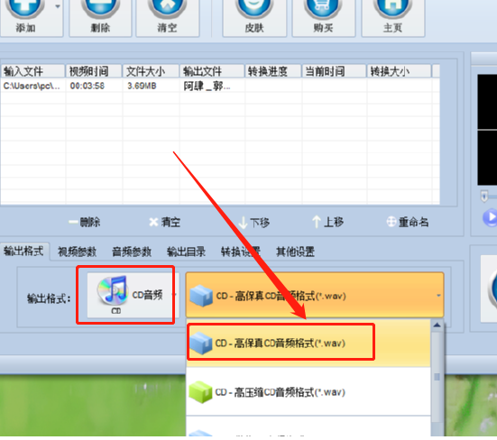 3.点击打开按钮之后在软件界面的输出格式模块中我们就可以选择CD音频类型,然后再选择想要的CD文件格式了。