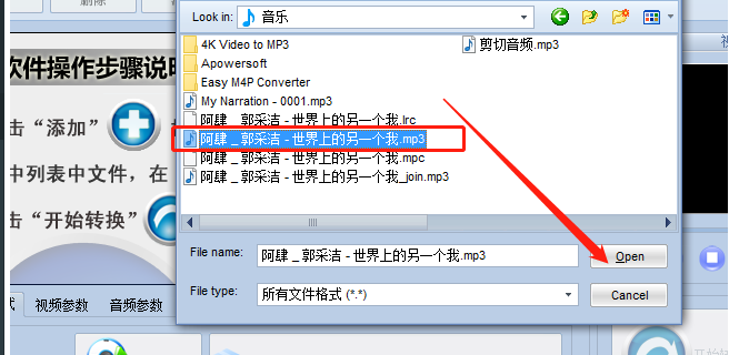 2.点击选择文件选项之后会打开选择文件的界面,在这个界面中我们选中想要转换格式的音频文件之后点击打开按钮。