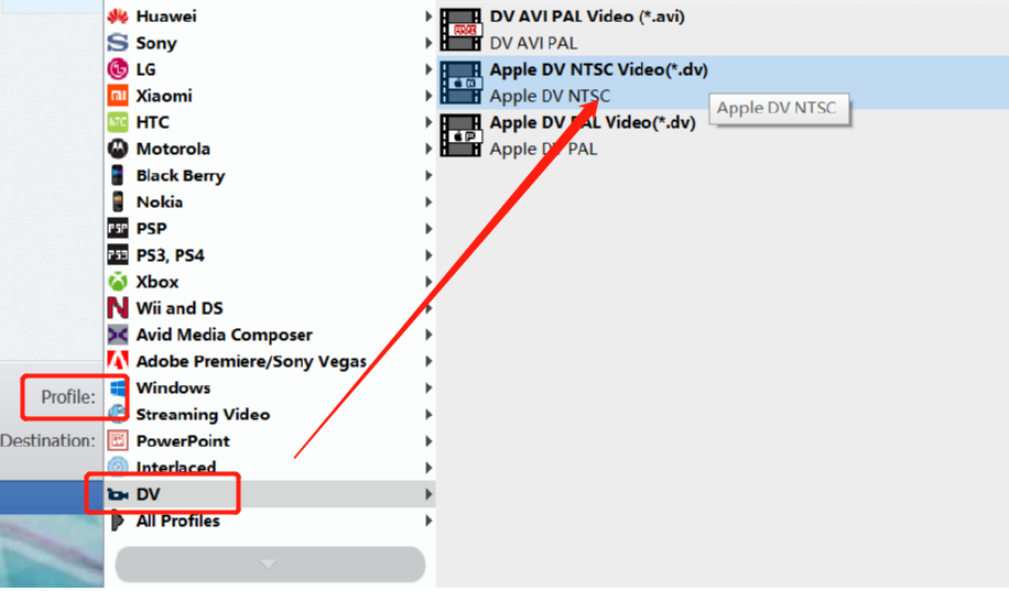 3.点击打开按钮之后下一步在界面中点击Profile选项将会打开选择转换格式的界面,在最下方找到DV选项之后选择我们想要的.dv文件格式。