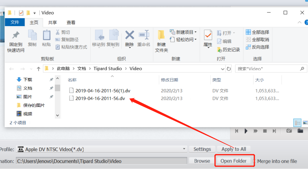 5.等到转换完成之后,我们点击界面下方的Open Folder这个功能按钮即可打开转换之后的文件所在的文件夹,就可以查看转换之后的DV文件了。