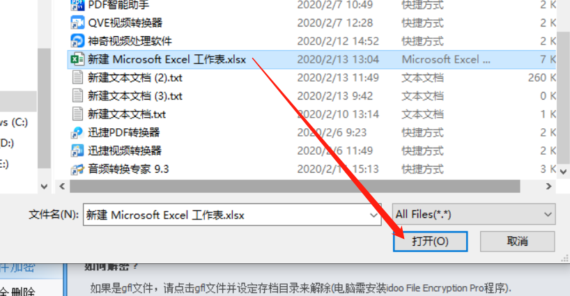 2.点击这个添加文件按钮之后,下一步就可以在出现的界面中选择要加密的文件了,找到目标文件选中之后点击打开按钮即可。