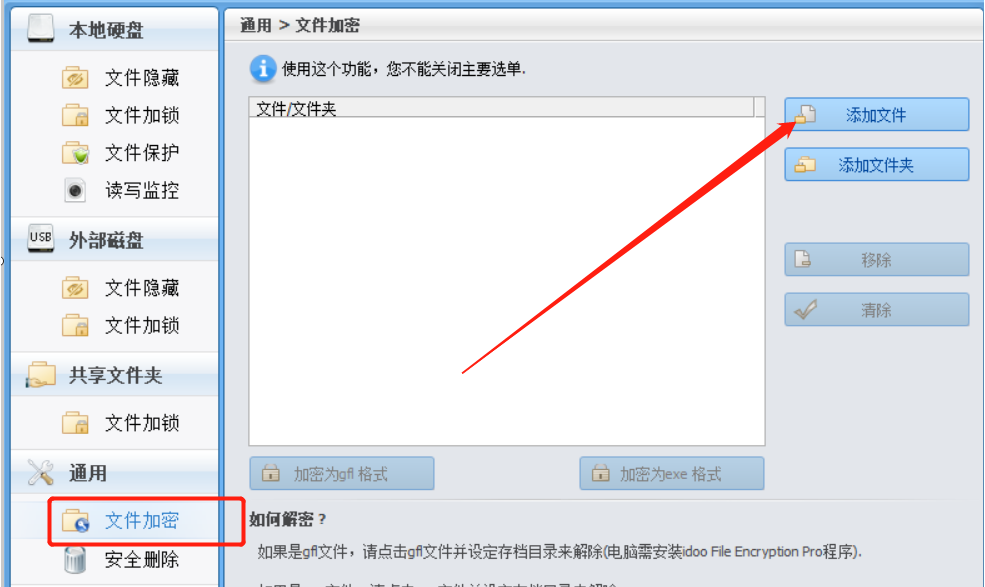 1.首先第一步我们打开软件之后在软件的主界面左边找到文件加密这个功能选项,点击之后再点击右边的添加文件按钮。