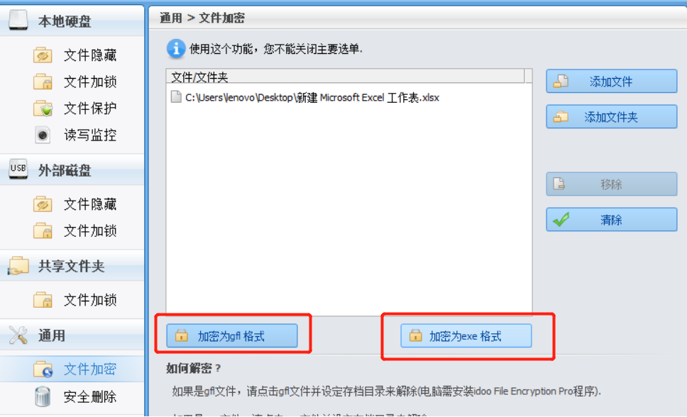 3.点击打开按钮之后下一步文件就成功添加到软件中了,然后我们可以选择加密为gfl格式和加密为exe格式,根据用户的需求选择可。