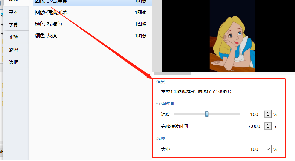 3.进入到幻灯片样式的设置界面之后,在图像这个模块中可以对图像的占屏方式进行选择,以及调整图像的持续时间。