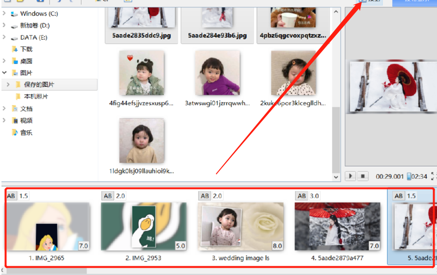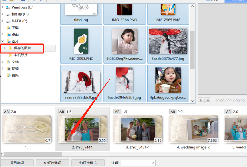 1.首先第一步我们打开软件之后需要在界面的左侧文件夹中,打开想要制作成幻灯片的图片文件所在的文件夹,然后选中图片将它们拖动到下方的操作台中。