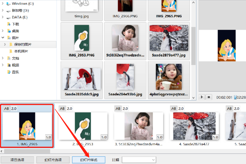 2.点击将图片拖动到操作台之后,选中其中的一张图片并点击下方的幻灯片样式这个按钮可以对图片的效果进行设置。