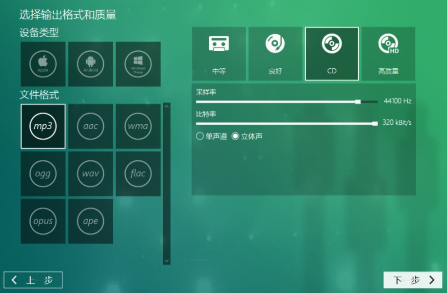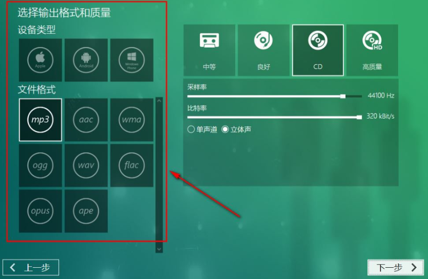 7、选择输出格式,其提供了mp3、aac、wma、ogg、ape等多种常见的预设,您也可以选择设备格式,其支持Apple、Android、Windows等常见的格式。