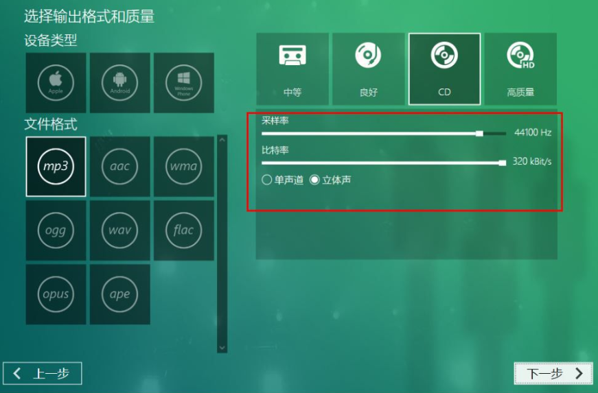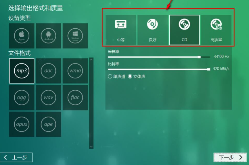 8、选择音频质量,其提供了中等、良好、CD、高质量等多种转换类型。