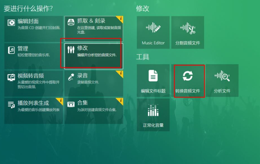 2、用户点击功能栏上的【修改】按钮,然后在右侧呼出的工具一栏下选择【转换音频文件】选项。