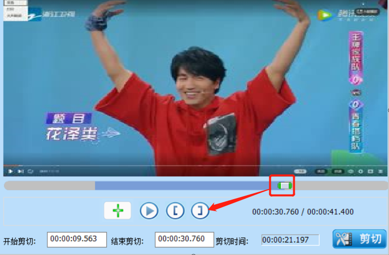 5.然后我们使用同样的方法来移动指针,点击下图箭头指向的按钮可以选择剪切片段的结束时间。