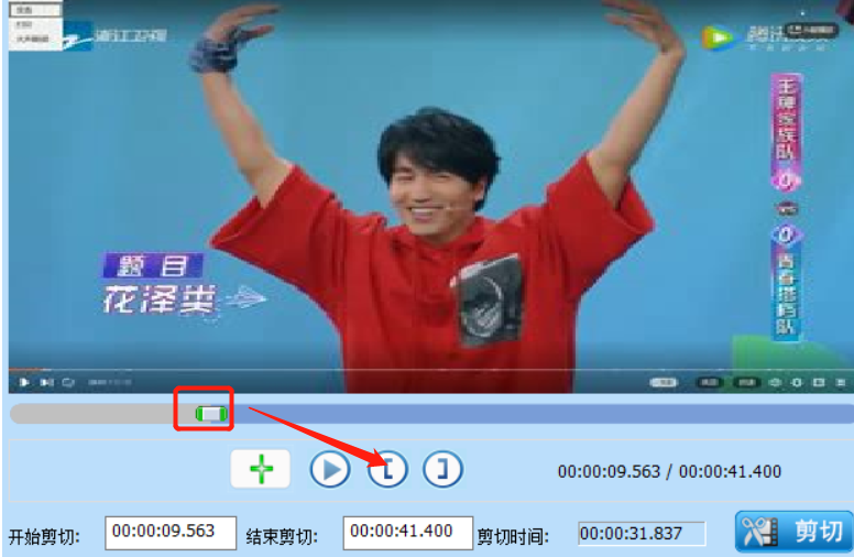 4.点击打开按钮将这个视频文件添加到软件界面之后,我们在界面中移动进度条上的指针,然后点击箭头指向的图标可以选择剪切的开始时间。