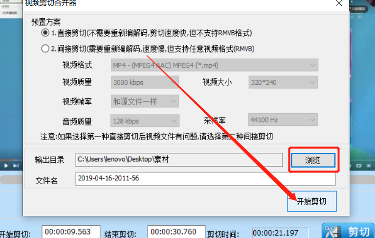 7.点击剪切按钮之后会出现下图所示的界面,在其中我们可以点击浏览按钮来更改输出目录,最后点击开始剪切按钮就可以开始剪切文件的操作了。