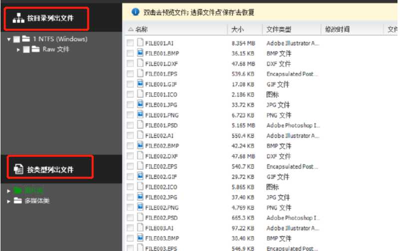 3.等到扫描完成之后在界面的左边可以看到有两种扫描文件的显示方式,一种是按目录列出文件,另一种是按类型列出文件,我们在其中找到想要恢复的图片文件即可。