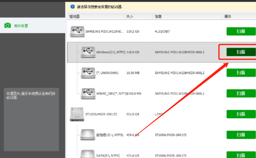1.首先第一步打开软件之后在软件的主界面中选择要扫描文件的那一个磁盘或分区,然后点击后面的扫描按钮。