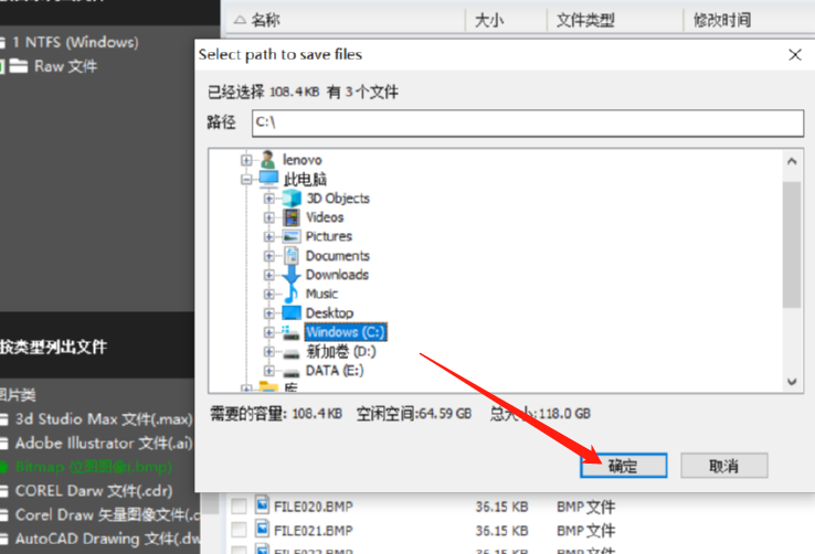 5.点击保存到按钮之后紧接着会打开一个让我们选择文件储存位置的窗口,我们在其中选中恢复文件要保存的位置之后点击确定按钮即可开始恢复。