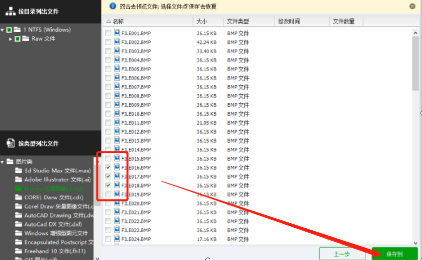 4.点击找到要恢复的图片文件之后,我们勾选图片文件前面的方框,勾选之后点击右下角的保存到这个按钮。