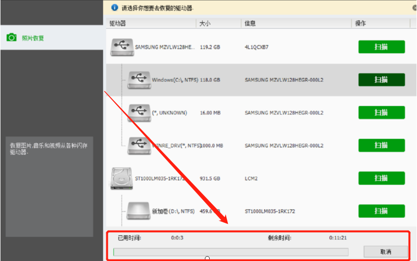 2.点击扫描按钮之后软件就会自动开始扫描了,在界面的下方可以看到扫描的进度,也可以点击取消按钮取消扫描。