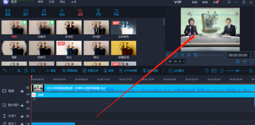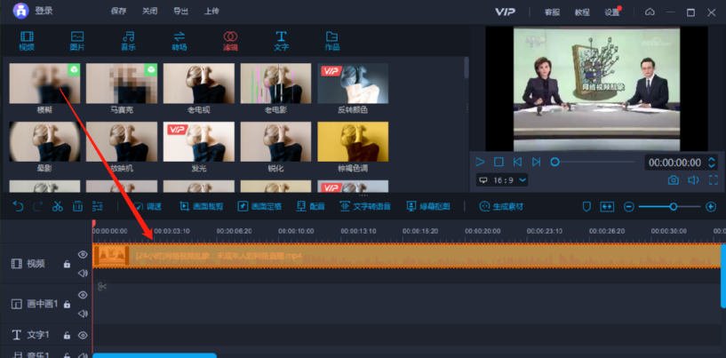 6.找到模糊滤镜之后点击将它拖动到下方视频操作台中,鼠标点击滤镜之后不放,移动到下方操作台视频的下面就可以了。