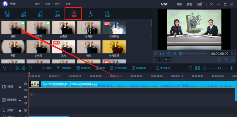 5.点击将视频添加到下方的操作台之后,我们找到界面上方的滤镜功能点击,点击之后在出现的滤镜素材中就可以看到有模糊滤镜了。