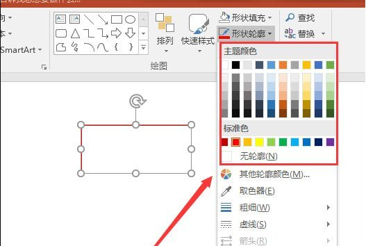 3、画好形状图形过后,选择刚才画的图形,然后点击上面的形状轮廓,这里会弹出一个属性选择框,可以选择颜色,轮廓颜色,或者其他的属性;