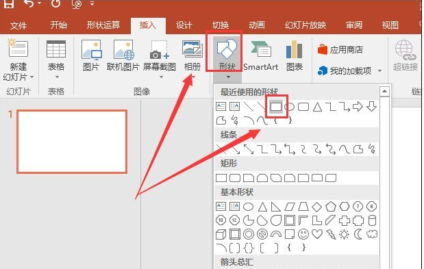 2、在插入的工具栏当中找到形状,这里我们选择一个矩形框来演示吗,然后在界面上面画出来;