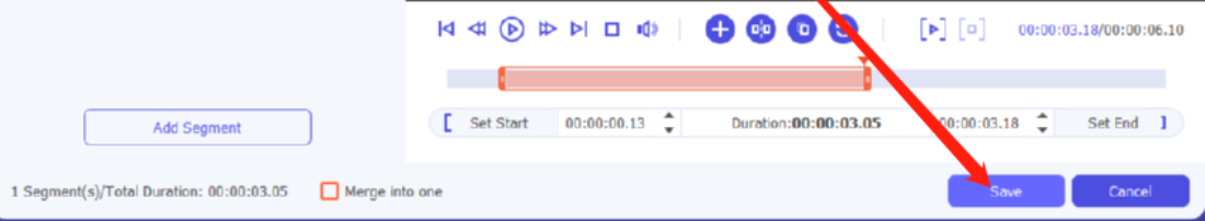 6.设置好开始时间和结束时间之后想要剪切的视频片段就选择完成了,然后我们需要点击界面右下方的Save这个保存按钮。