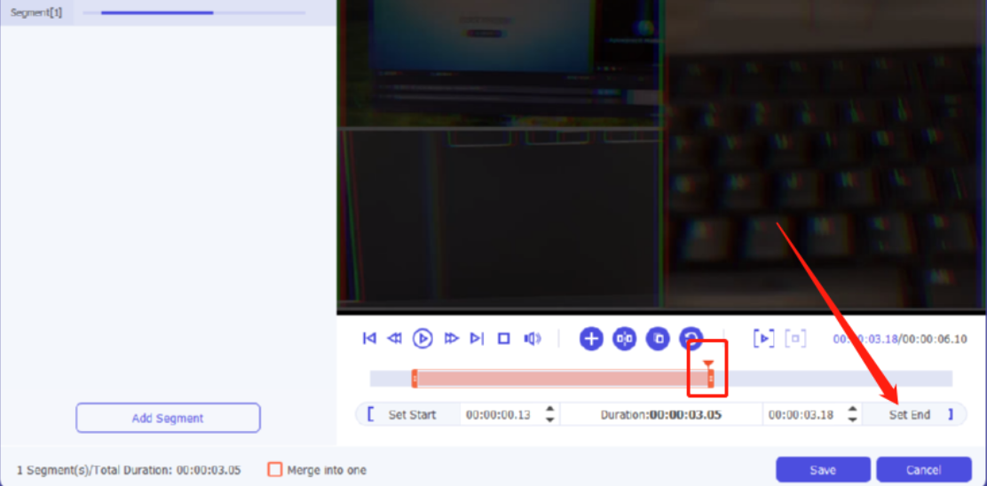 5. 下一步移动指针到想要剪切的结束时间位置,点击右边的Set End这个设置结束按钮之后就可以设置剪切视频的结束时间了。
