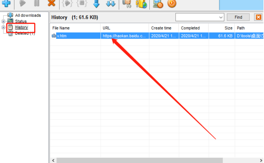 6.最后等到下载完成,我们在界面左边的列表中点击History这个下载历史选项就可以在界面中看到已经下载的网页文件了。