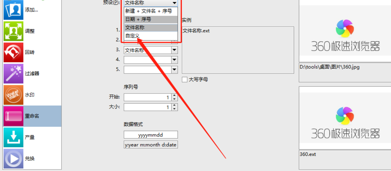 4.切换到重命名文件的功能界面之后,我们可以打开预设选项的文件名称下拉列表,然后在这个列表中选择想要使用的重命名方式,也可以选择自定义选项。
